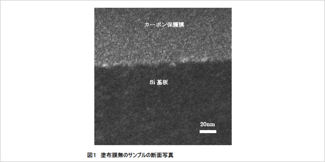 | ブランク試験として実施した塗布されていないSi基板の表面の断面観察像を図1に示す。Si基板と保護膜としてコーティングしたカーボン膜との間には何も存在しない。 |